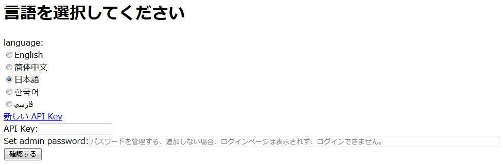 言語・API Key・admin password(管理パスワード)の3つを設定します。
