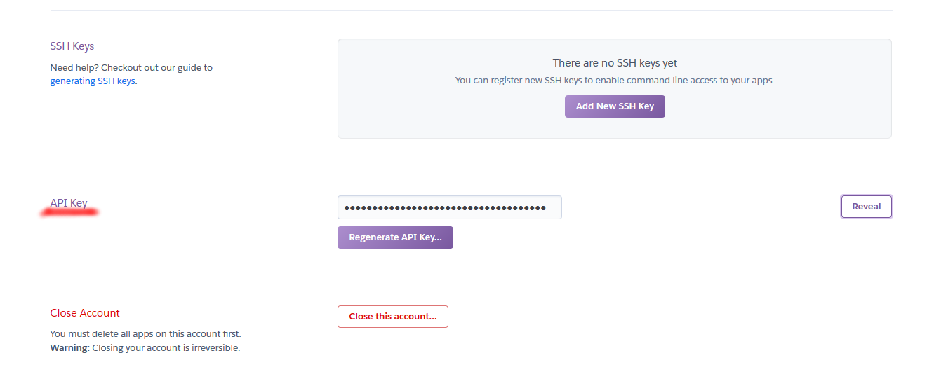Herokuのアカウントページが開くので、下にスクロールすると「API Key」の項目があります。