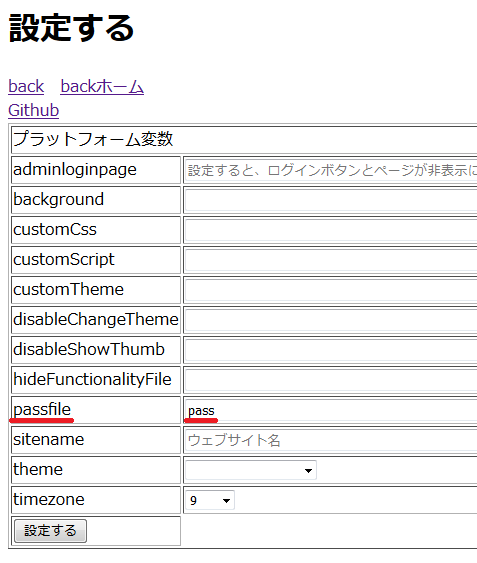 設定ページの「passfile」の項目に適当な名前(ここでは"pass"とする)を入力します。